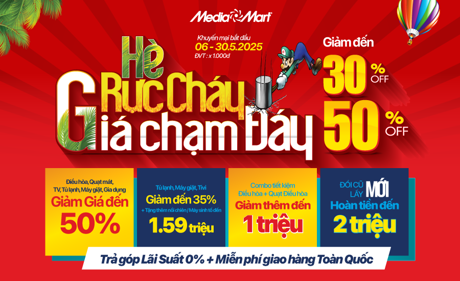 Nhiệt độ ngoài trời tăng cao nhưng giá nhiều mặt hàng tại Media Mart lại giảm, bởi vì hàng ngàn deal HÈ RỰC CHÁY - GIÁ CHẠM ĐÁY đang trên đường đổ bộ hệ thống hơn 400 siêu thị trên toàn quốc cũng như trên website chính thức. Tham gia ngay siêu hội săn deal từ ngày 06/5 đến ngày 30/5/2025 để sở hữu những sản phẩm chính hãng, chất lượng với mức giá cực tốt.