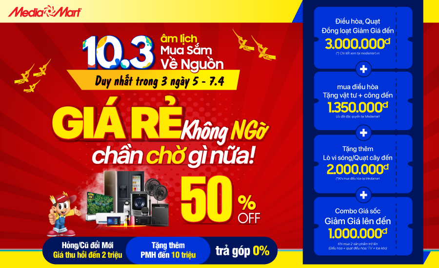 Nghỉ lễ Giỗ Tổ Hùng Vương thường vào đầu mùa hè, cũng là khoảng thời gian nhiều người có nhu cầu mua sắm các sản phẩm điện máy, điện lạnh, gia dụng, thiết bị công nghệ… phục vụ cuộc sống cũng như công việc học tập. Đáp ứng ngay nhu cầu của khách hàng, MediaMart mang đến chương trình khuyến mãi hấp dẫn “MUA SẮM VỀ NGUỒN - 3 NGÀY GIÁ RẺ KHÔNG GIỜ - CHẦN CHỜ GÌ NỮA!!”. Với hàng loạt sản phẩm giảm giá lên đến 50% cùng nhiều khuyến mãi và ưu đãi hấp dẫn trong 3 ngày từ 05/4 - 07/4/2025, khách hàng chắc chắn sẽ lựa chọn được món đồ ưng ý với mức giá bất ngờ, chưa từng có.