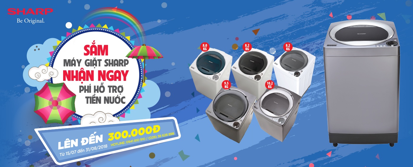 Từ 01/09/2018 - 30/09/2018, Mua sản phẩm máy giặt Sharp chính hãng tại Siêu thị điện máy Mediamart trên toàn quốc, khách hàng sẽ được nhận ngay phí hỗ trợ tiền nước trị giá đên 300.000đ