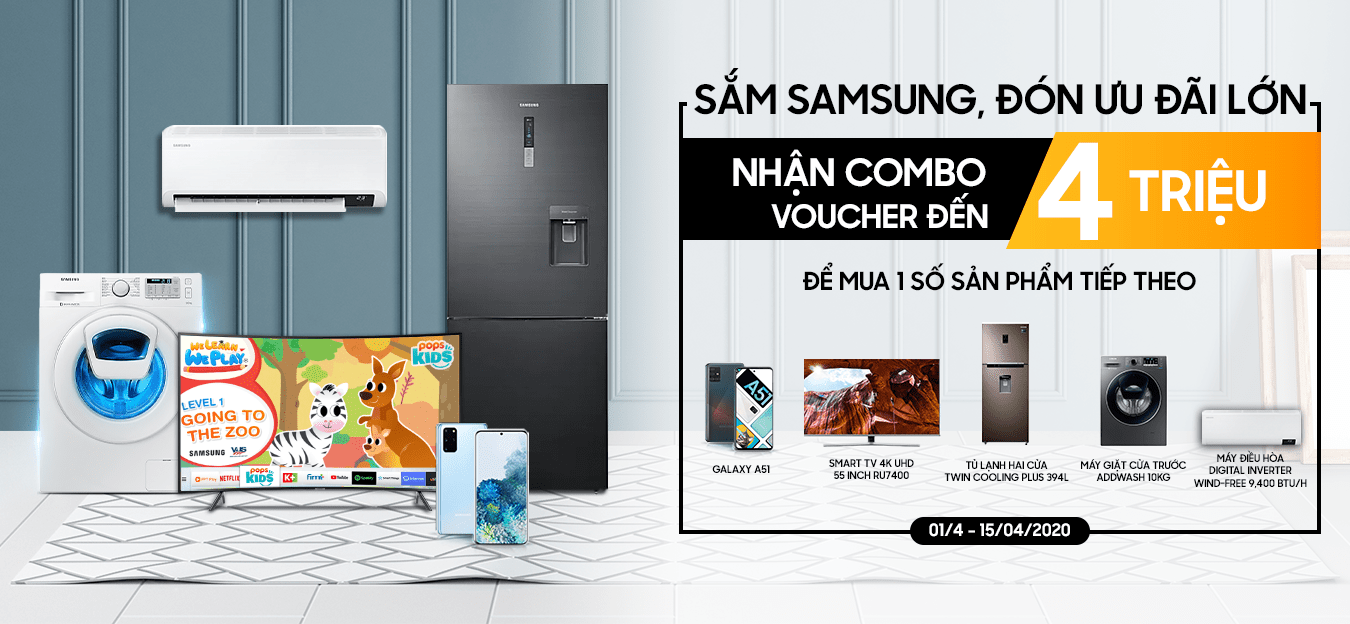 Chương trình ưu đãi dành cho khách hàng khi mua bất kỳ các sản phẩm Samsung gồm điện thoại di động thông minh, máy tính bảng, TV, thiết bị nghe nhìn (sound bar, âm thanh không dây đa chiều, dàn giải trí tại gia, đầu phát blu-ray và DVD), tủ lạnh, máy giặt, máy sấy, máy lọc không khí, máy hút bụi, lò vi sóng, máy điều hòa, tại hệ thống siêu thị điện máy MediaMart trên toàn quốc từ ngày 01/04/2020 đến hết ngày 15/04/2020.