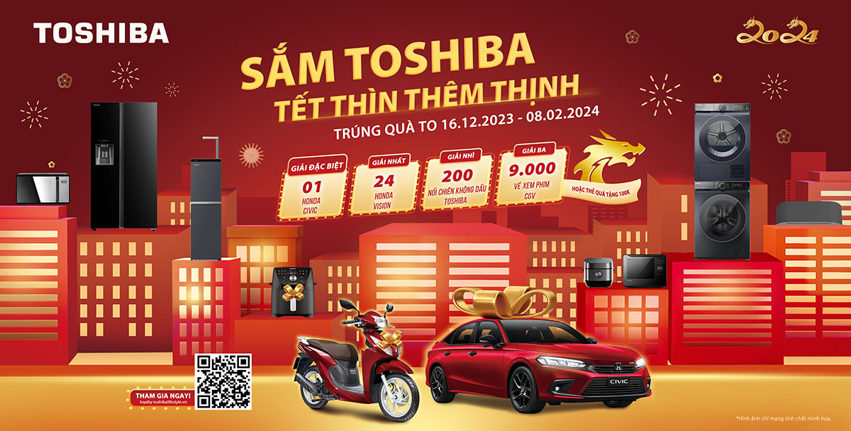 Chào đón năm 2024 và tri ân Khách hàng đã tin dùng trong suốt thời gian qua, Toshiba kết hợp cùng hệ thống Siêu thị điện máy MediaMart tung ưu đãi cực khủng “Sắm Toshiba, Tết thìn thêm thịnh” với tổng giá trị giải thưởng lên đến hơn 3 tỉ đồng. Đặc biệt, tham gia chương trình, Khách hàng còn được nhân đôi cơ hội khi vừa quay số trúng ngay vừa có cơ hội rước thêm xế xịn Honda Civic thời thượng vào cuối chương trình.