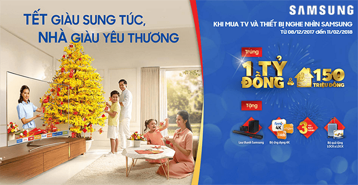 Từ 8/12/2017 - 11/2/2018, Công ty CP Mediamart Việt Nam và Samsung Việt Nam cùng thực hiện chương trình ưu đãi lớn "Tết Giàu Sung túc - Nhà Giàu Yêu thương", theo đó khi mua các sản phẩm Tivi, Tủ lạnh, Máy giặt, Điều hòa nhiệt độ Samsung tại Mediamart, khách hàng sẽ nhận được hàng loạt quà tặng giá trị và có cơ hội Trúng 1 Tỷ đồng & 8 Bộ quà Samsung 150 Triệu đồng.