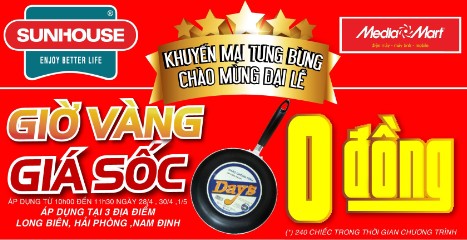 Từ 10h00 đến 11h30 ngày 28/4 , 30/4 và 1/5, Sunhouse bán ra 240 chảo chống dính chỉ với giá 0 đồng cho những khách hàng may mắn.