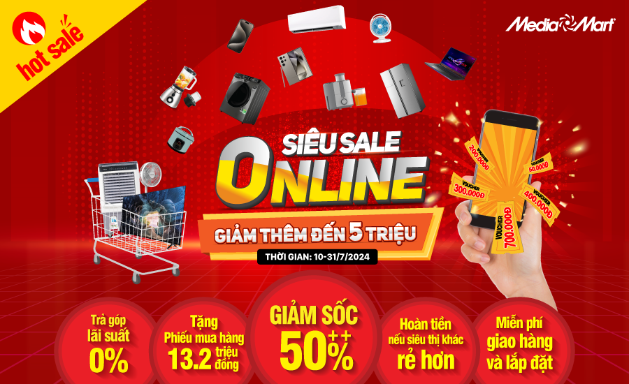 MediaMart tưng bừng triển khai chương trình "Siêu Sale Online – Giảm thêm đến 5 Triệu", giảm đến 50%, giảm thêm đến 5 triệu đồng, tặng PMH 13.2Tr, hoàn tiền nếu siêu thị khác rẻ hơn,… Đây là dịp để bạn mua sắm Online các sản phẩm tivi, gia dụng, laptop, điện thoại,… chính hãng với mức giá hời. Chương trình diễn ra từ ngày 10/07/2024 đến hết ngày 19/07/2024. Săn sale online ngay!
