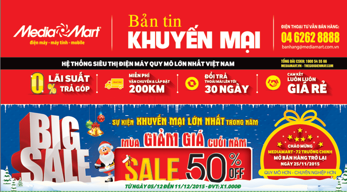 Với khuyến mại chồng khuyến mại, đây được coi là thời điểm tốt để mua sắm hay đổi mới ngay những chiếc TV LED với ngân sách tiết kiệm tối đa thay vì chờ đến cận tết, giá cả sản phẩm tăng, các model ưng ý thường hết hàng, chính sách giao vận – lắp đặt không được đảm bảo. Ngoài ra, tại MediaMart cũng đang diễn ra nhiều chương trình khuyến mại lớn áp dụng cho hàng ngàn mặt hàng điện máy – máy tính – mobile như: 10 ngày vàng – tặng quà trị giá đến 2 triệu dành cho các sản phẩm tủ lạnh, máy giặt Electrolux, mua tủ lạnh side by side và tủ 6 cánh Hitachi tặng thêm máy giặt trị giá 15 triệu đồng, thiết bị sưởi giá chỉ từ 189.000đ, lò vi sóng Goldsun – Electrolux- Sharp chỉ từ 950.000đ, laptop model mới giá chỉ từ 4.990.000đ, mua smartphone tặng tiền mặt đến 2 triệu, mua tablet tặng bộ quà 1 triệu… Chưa dừng ở đó, các trung tâm và siêu thị điện máy lớn còn tích cực hỗ trợ cho khách hàng trong dịp cuối năm. Như khi mua hàng tại Media Mart, khách hàng được áp dụng việc vận chuyển miễn phí lên tới 200km, hỗ trợ đổi hàng lên đến 30 ngày, trả góp trả trước 0 đồng, lãi suất 0%.
