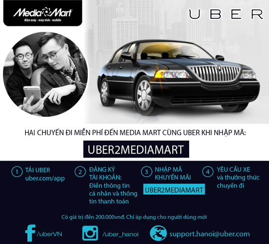 Sôi động cùng mùa hè 2015, miễn phí hai chuyến đến và đi từ MediaMart bằng tài xế riêng Uber. Chưa dừng ở đó, đến MediaMart bằng Uber, bạn còn được nhận ngay gói 4 ưu đãi khủng dành cho các sản phẩm smartphone
