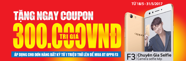 Coupon quay lại được ưu đãi chiết khấu giảm giá: Giảm giá 300.000 VNĐ cho Oppo F3