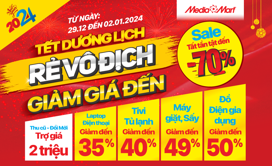 Mừng Tết Dương lịch 2024, MediaMart mang đến chương trình khuyến mại cực hấp dẫn “Tết Dương lịch – Rẻ vô địch” giảm giá sâu đến 70% cho hàng ngàn sản phẩm điện máy, công nghệ cùng nhiều quà tặng giá trị. Chớp ngay cơ hội mua sắm đón Tết không cần nhìn giá này ngay thôi! Chương trình diễn ra từ 29/12/2023 – 02/01/2024.