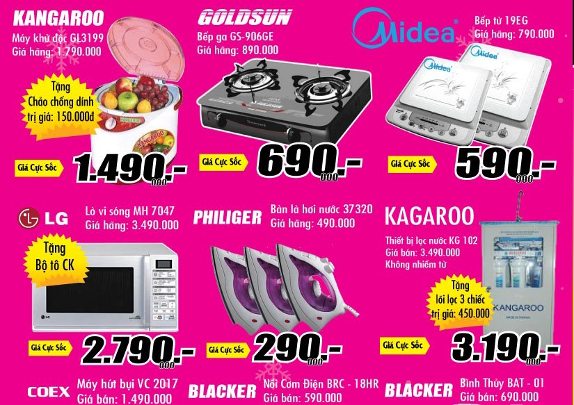 - Giảm giá trực tiếp trên sản phẩm như: Lò vi sóng LG MH 7047 giá khuyến mại 2.790.000 đồng giảm 700.000 đồng so với giá hãng đồng thời tặng bộ tô CK; Máy hút bụi Coex VC2017 giá khuyến mại còn 1.190.000 đồng; Máy khử độc rau quả Kangaroo GL3199 giá khuyến mại 1.490.000 đồng;….cùng rất nhiều các sản phẩm khác. - Tặng bát thủy tinh Luminarc trị giá 120.000 đồng cho tất cả bàn là Tefal.