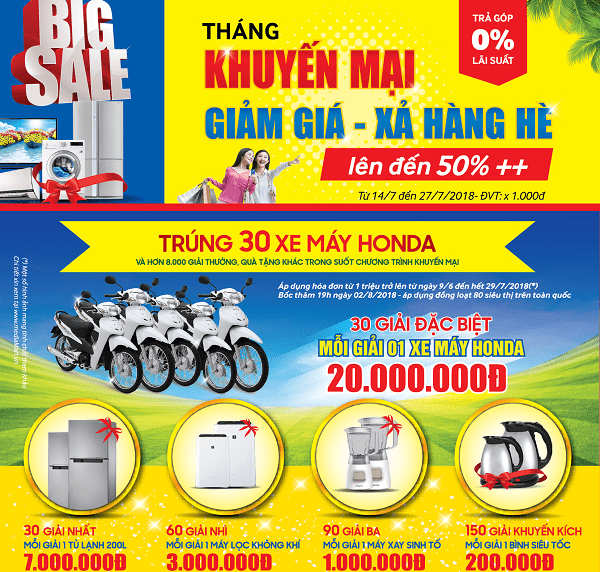 Cơ hội trúng thưởng đặc biệt 30 xe máy Honda và hơn 8.000 giải thưởng, quà tặng khác trong suốt thời gian diễn ra chương trình. 30 giải nhất mỗi giải 1 tủ lạnh 200L trị giá 7.000.000đ. 60 giải nhì mỗi giải 1 máy lọc không khí trị giá 3.000.000đ. 90 giải ba, mỗi giải 1 máy xay sinh tố trị giá 1.000.000đ. 150 giải khuyến khích mỗi giải 1 bình siêu tốc trị giá 200.000đ. Tổng ngân sách khuyến mại lên đến 10 tỷ đồng.