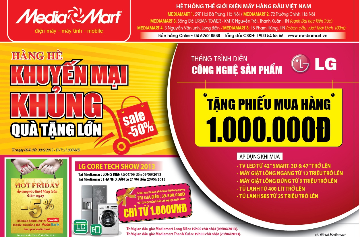 Từ ngày 6/6 đến 30/6/2013, Media Mart phối hợp cùng LG Việt Nam mang đến người tiêu dùng “Tháng trình diễn công nghệ sản phẩm LG” với ngân sách khuyến mại lên tới hàng tỷ đồng.