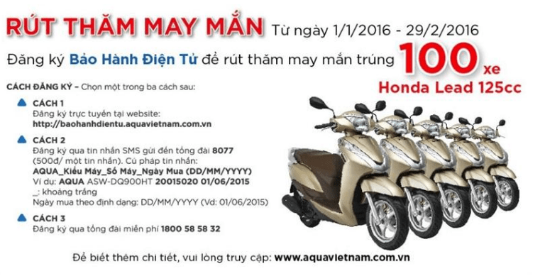 - Trong thời gian khuyến mại, khách hàng đăng ký bảo hành sau khi mua các sản phẩm điện máy của Công ty TNHH Điện máy AQUA Việt Nam sẽ được tham gia chương trình khuyến mại và có cơ hội trúng thưởng một trong các giải thưởng tại cơ cấu giải thưởng nêu trên.