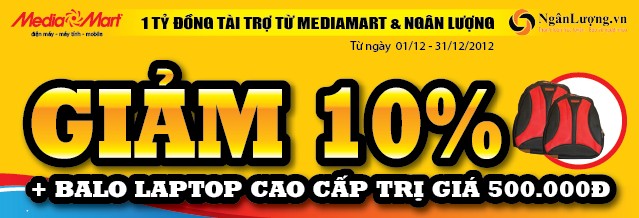 Từ ngày 1/12/2012 đến hết ngày 31/12/2012, khách mua các sản phẩm Điện máy, Máy tính, Mobile tại website https://mediamart.vn và thanh toán qua Ví điện tử NgânLượng.vn sẽ được giảm thêm 10% trên giá hiện tại và được tặng thêm 01 ba lô laptop cao cấp trị giá 500.000 VNĐ