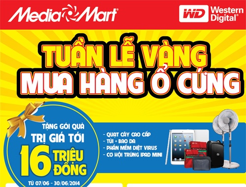 - Với hóa đơn mua Khách hàng mua Ổ cứng Western Digital bất kỳ tại các cửa hàng thuộc hệ thống Media Mart, khách hàng sẽ được tham gia vào chương trình bốc thăm trúng thưởng “Tuần lễ vàng dành cho HDD”.