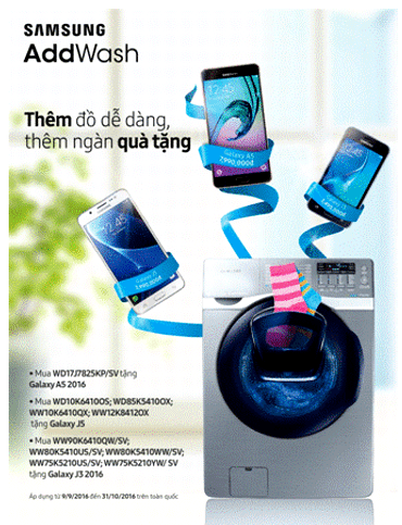 Từ 09/9/2016 đến hết 31/10/2016, Mediamart phối hợp cùng Samsung Việt Nam đồng thực hiện chương trình khuyến mại "Thêm đồ dễ dàng - Thêm ngàn quà tặng". Theo đó trong thời gian diễn ra CTKM, khi mua máy giặt SAMSUNG tại các siêu thị điện máy Mediamart trên toàn quốc, khách hàng sẽ nhận được quà tặng Smartphone Samsung Galaxy A5-2016, Galaxy J5, Galaxy J3 cực hấp dẫn.