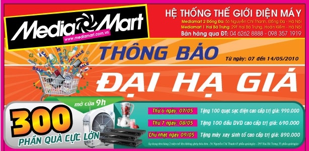 Khởi động mùa hè với một không khí đầy nóng bỏng và tưng bừng, từ ngày 07/05 đến hết ngày 14/05/2010 tại Thế giới điện máy Mediamart sẽ diễn ra chương trình khuyến mại “ Đại hạ giá” với hàng ngàn quà tặng và sản phẩm siêu giảm giá hấp dẫn.