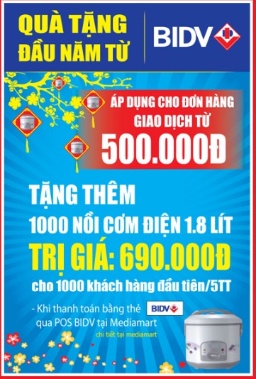 Ngân hàng TMCP đầu tư và phát triển Việt Nam (BIDV) và CTY CP MediaMart Việt Nam xin chân thành cảm ơn sự ủng hộ, hưởng ứng nhiệt tình của Quý khách hàng đối với các chương trình ưu đãi cho chủ thẻ BIDV mua sắm tại hệ thống Thế giới Điện máy MediaMart.