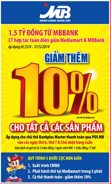 Theo thể lệ chương trình "Ưu đãi lớn cuối tuần - Giảm thêm 10% cho chủ thẻ Bankplus Master mới phát hành mua sắm tại MediaMart" trong các ngày thứ 6, 7, chủ nhật hàng tuần, chương trình sẽ kết thúc khi đạt mức ngân sách quy định.