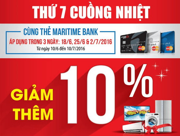 1. Ưu đãi 1: Thứ 7 cuồng nhiệt cùng thẻ MaritimeBank – Giảm 10% cho tất cả các mặt hàng vào 03 ngày thứ 7 ngày 18/6, 25/6 và 2/7/2016