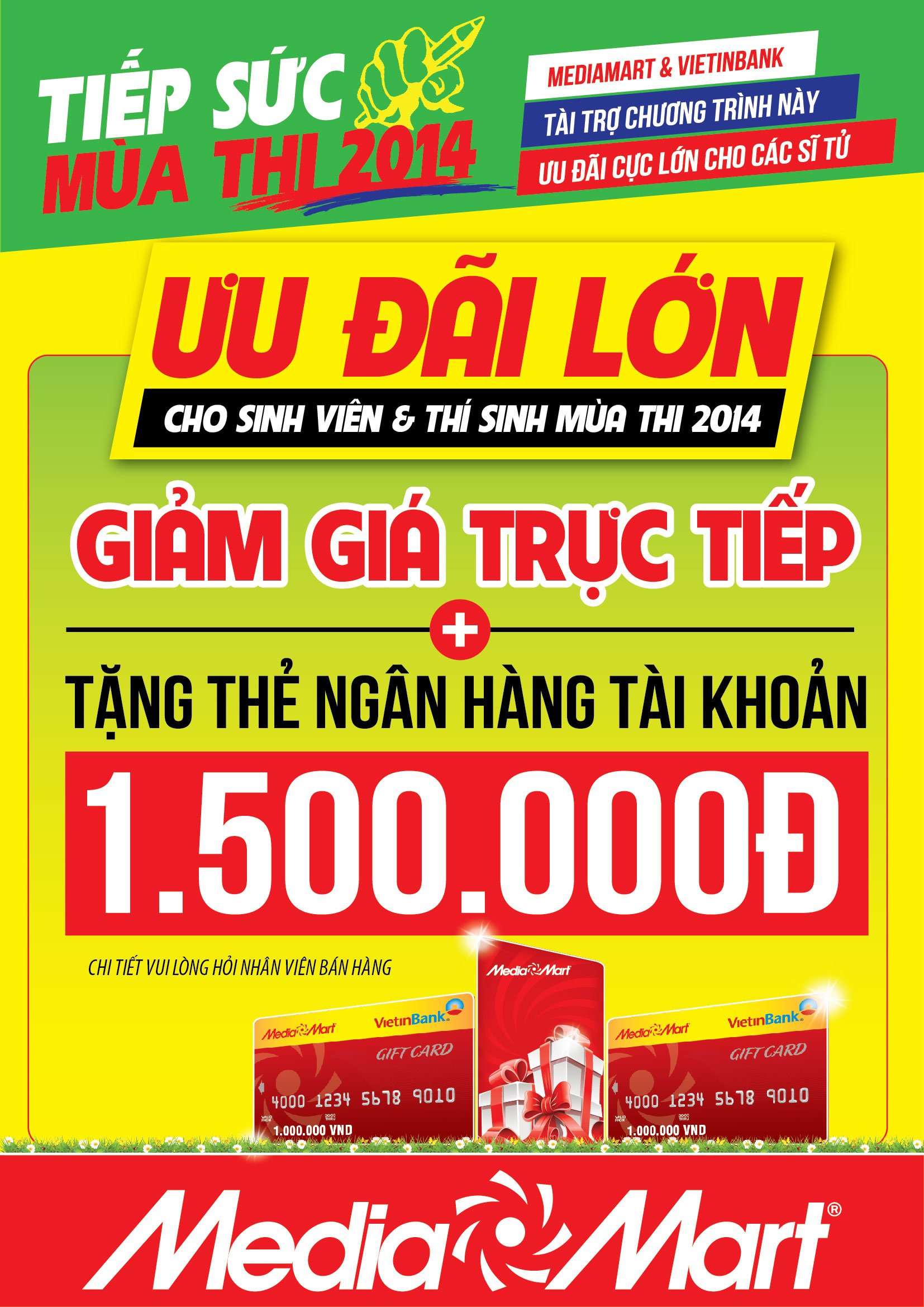 Theo đó từ 3/7 đến hết 20/7, MediaMart tặng 3000 GiftCard đồng thương hiệu MediaMart – Vietinbank tài khoản 1.5 triệu đồng cho các sĩ tử của kỳ thi 2014 cùng sinh viên các trường đại học, cao đẳng, trung học chuyên nghiệp và dạy nghề trên toàn quốc có hóa đơn mua hàng từ 800.000 đồng tại MediaMart.