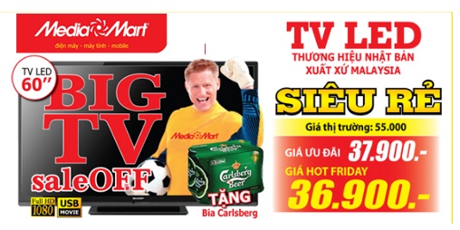Đầu tiên phải kể đến TV 3D LED Sharp LE630M 60 inch có giá niêm yết 55.000.000 triệu đồng. Tại Media Mart, mức giá ưu đãi chỉ còn 37.900.000 đồng khiến cho LE630M của Sharp trở thành một trong những model 60 inch có giá bán tốt nhất trên thị trường trước đến nay.