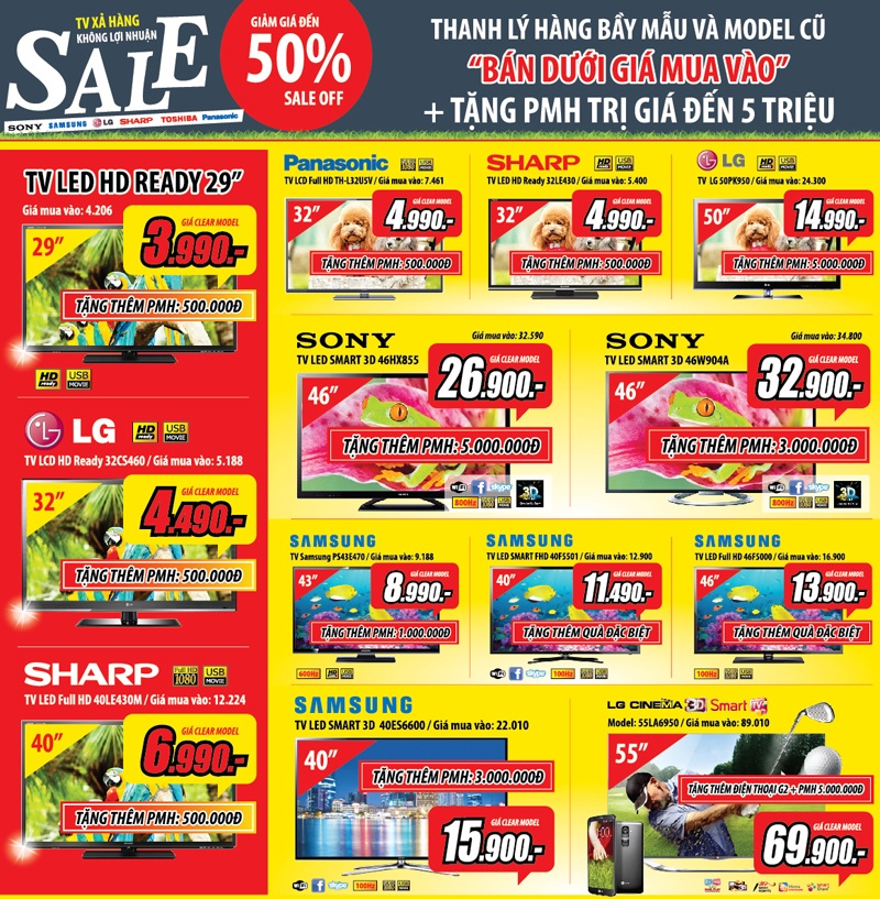 Kéo dài trong vòng 12 ngày, đây là cơ hội lớn trong năm nằm trong chương trình “Thanh lý hàng bày mẫu” do Media Mart phối hợp với Sony, Samsung, LG, Panasonic, Sharp... thực hiện. Theo đó, các sản phẩm bày mẫu được MediaMart "BÁN DƯỚI GIÁ MUA VÀO + TẶNG PHIẾU MUA HÀNG TRỊ GIÁ ĐẾN 5 TRIỆU"