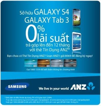 Media Mart hợp tác cùng Samsung Vietnam và ANZ triển khai chương trình mua hàng trả góp sản phẩm Galaxy S4 và Galaxy Tab 3 với lãi suất 0% trong thời gian 12 tháng cho chủ thẻ tín dụng ANZ