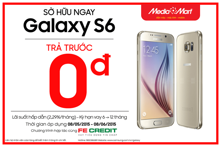 Từ 08/5/2015 đến 08/6/2015, Media Mart mang đến cho quý khách hàng phương thức mua trả góp với ưu đãi đặc biệt Trả trước 0 đồng của FE CREDIT (VPBank) dành cho "Siêu phẩm" Samsung Galaxy S6 cực Hot với chi tiết cụ thể như sau: