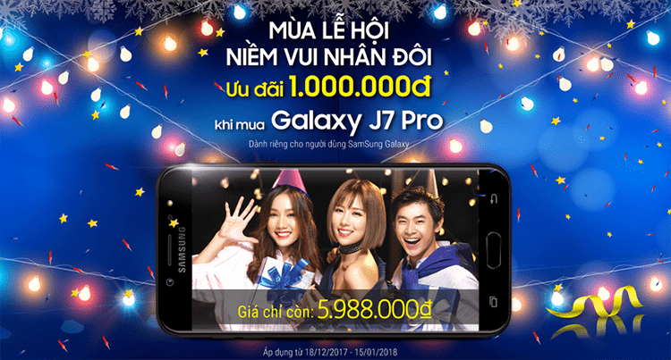 - Giảm ngay 1.000.000 đồng khi mua điện thoại Galaxy J7 Pro với mã ưu đãi trên ứng dụng Quà tặng Galaxy. Mã ưu đãi dành riêng cho khách hàng đang sở hữu sản phẩm điện thoại thông minh Samsung Galaxy chính hãng