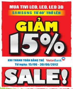 Đồng loạt giảm giá 30% tất cả các sản phẩm TV. Từ 16/6 đến 15/7, Media Mart tiếp tục phối hợp cùng Vietinbank giảm thêm 15% hoá đơn thanh toán bằng thẻ VietinBank trên POS VietinBank khi mua Tivi Samsung LCD, LED, LED 3D từ 40 inches trở lên.