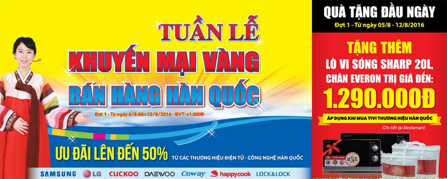 Từ 5/8, Hệ thống Thế giới điện máy MediaMart cùng các tập đoàn điện tử Hàn Quốc triển khai chương trình “Tuần lễ khuyến mại vàng bán hàng Hàn Quốc tại MediaMart” mang đến cho người tiêu dùng cơ hội mua sắm các sản phẩm điện máy, công nghệ thương hiệu Hàn Quốc với mức giá cực kỳ hấp dẫn.