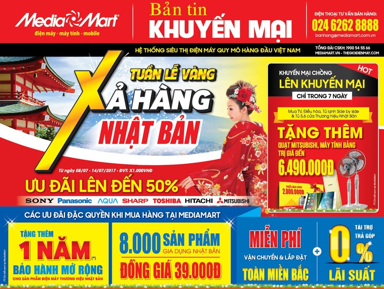 Hệ thống Thế giới điện máy MediaMart cùng các tập đoàn điện tử Nhật Bản triển khai chương trình “Tuần lễ khuyến mại vàng xả hàng Nhật Bản tại MediaMart” mang đến cho người tiêu dùng cơ hội mua sắm các sản phẩm điện máy, công nghệ thương hiệu Nhật Bản với mức giá cực kỳ hấp dẫn.
