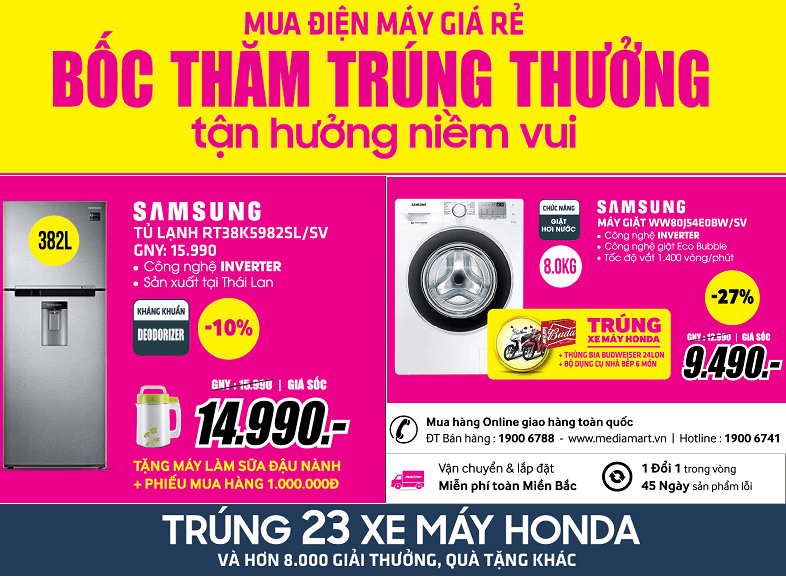 Loạt sản phẩm giá sốc không thể bỏ qua phải kể đến: Tủ lạnh Samsung 234L RT22FARBDSA/SV giảm 26% giá khuyến mại 5,690,000đ; Tủ lạnh Samsung 382L RT38K5982SL/SV giảm 9% giá chỉ còn 14.590.000đ tặng máy làm sữa đậu nành Bluestone SMB-7326 (901602); Tủ lạnh SBS Samsung 591L RS552NRUA9M/SV giảm 19% giá chỉ còn 29.990.000đ tặng điện thoại Samsung J6; Máy giặt Samsung 9kg WA90J5710SG/SV giảm 23% giá chỉ còn 6.190.000đ, tặng bộ dụng cụ nhà bếp 6 món Cookplus CKK101S01 (901603); Máy giặt Samsung 8KG WW80J54E0BW/SV giảm 27% giá khuyến mại 9.490.000đ; Máy giặt Samsung lồng đứng 9KG WA90M5120SG/SV giảm 16% giá chỉ còn 5.290.000đ
