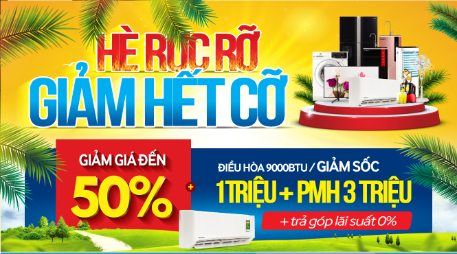 Trong thời điểm này mua điều hòa "Trùm giá rẻ". ĐIều hòa 9000BTU giá chỉ từ 4.490.000đ, tặng phiếu mua hàng gia dụng 3,000,000đ, bao phí vật Tư, lắp đặt; Giảm sốc từ 200.000đ đến 2.000.000đ;Tặng gói vật tư ống đồng tiêu chuẩn + công lắp đặt đến 1.500.000đ; Tài trợ trả góp 0% - trả trước 0 đồng; Bảo hành lỗi 1 đổi 1 đến 24 tháng; Tặng thêm máy xay sinh tố Coex trị giá đến 910.000đ; Tặng 01 bộ ưu đãi mua hàng gia dụng Coex trị giá 2,100,000đ