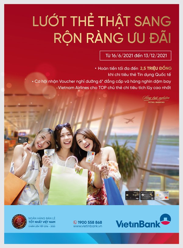 Khuyến mãi hoàn tiền? Ưu đãi dặm bay? Voucher nghỉ dưỡng giá trị? Tất cả sẽ có trong Chương trình khuyến mãi (CTKM) “Lướt thẻ thật sang - Rộn ràng ưu đãi” của VietinBank. Từ nay đến ngày 13/12/2021, VietinBank liên tục có những khuyến mãi hấp dẫn cho chủ thẻ Tín dụng Quốc tế (TDQT) Visa MasterCard, JCB với tổng giá trị ưu đãi hơn 6 tỷ đồng.