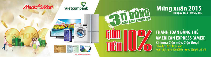 Tưng bừng Tháng 3 - "Tháng hành động vì quyền lợi người tiêu dùng", như một lời tri ân sự ủng hộ của khách hàng đối với sản phẩm thẻ mang thương hiệu American Express của Vietcombank, kể từ ngày 10/03/2015 đến hết ngày 10/05/2015, Mediamart và Vietcombank gửi tới Quý khách chương trình "Ưu đãi mua sắm dành cho tất cả chủ thẻ Vietcombank thương hiệu American Express" tại Media Mart, Giảm thêm 10% cho các giao dịch thanh toán bằng thẻ AMEX.