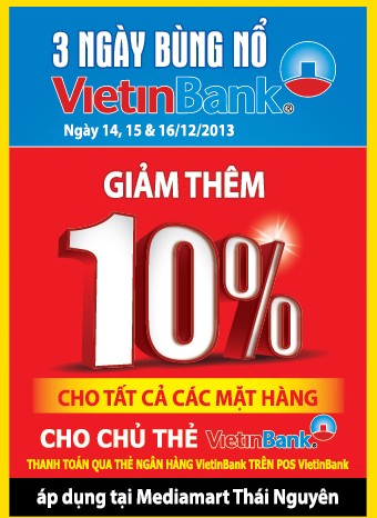 Trong 3 ngày vàng siêu bùng nổ 14,15,16/12, chủ thẻ Vietinbank được chiết khấu giảm giá 10% tất cả các mặt hàng được bày bán tại Media Mart Thái Nguyên.
