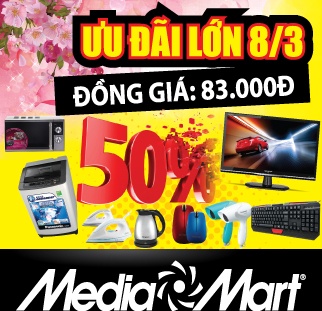 Chào mừng ngày quốc tế phụ nữ 8/3, thay lời chúc yêu thương dành tặng một nửa thế giới. MediaMart mang tới chương trình ưu đãi đặc biệt với gian hàng gia dụng đồng giá 83.000 đồng cùng hàng ngàn sản phẩm điện máy, máy tính, mobile được bán với mức giá xả hàng không lợi nhuận.