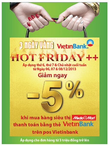Giảm thêm 5% cho chủ thẻ Vietinbank mua sắm tại Media Mart vào tất cả các ngày thứ 6, thứ 7 và chủ nhật tuần đầu tiên của tháng, bắt đầu từ thứ 6 ngày 01/11/2013 đến 9/02/2014, hoặc đến khi hết ngân sách khuyến mại.