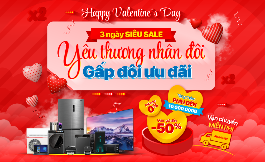 Ngày Lễ Tình nhân 14/2 đang đến gần, bạn đang tìm kiếm món quà ý nghĩa để dành tặng nửa kia của mình? Hãy đến ngay MediaMart để chớp cơ hội mua sắm hàng loạt sản phẩm chất lượng với giá giảm SỐC đến 50%, tặng kèm nhiều quà tặng giá trị trong chương trình “Valentine’s day (14/2)  – 3 ngày siêu sale – Yêu thương nhân đôi, gấp đôi ưu đãi”. Chương trình diễn ra từ ngày 14.02 đến hết ngày 16.02.2024. Săn sale Valentine ngay!