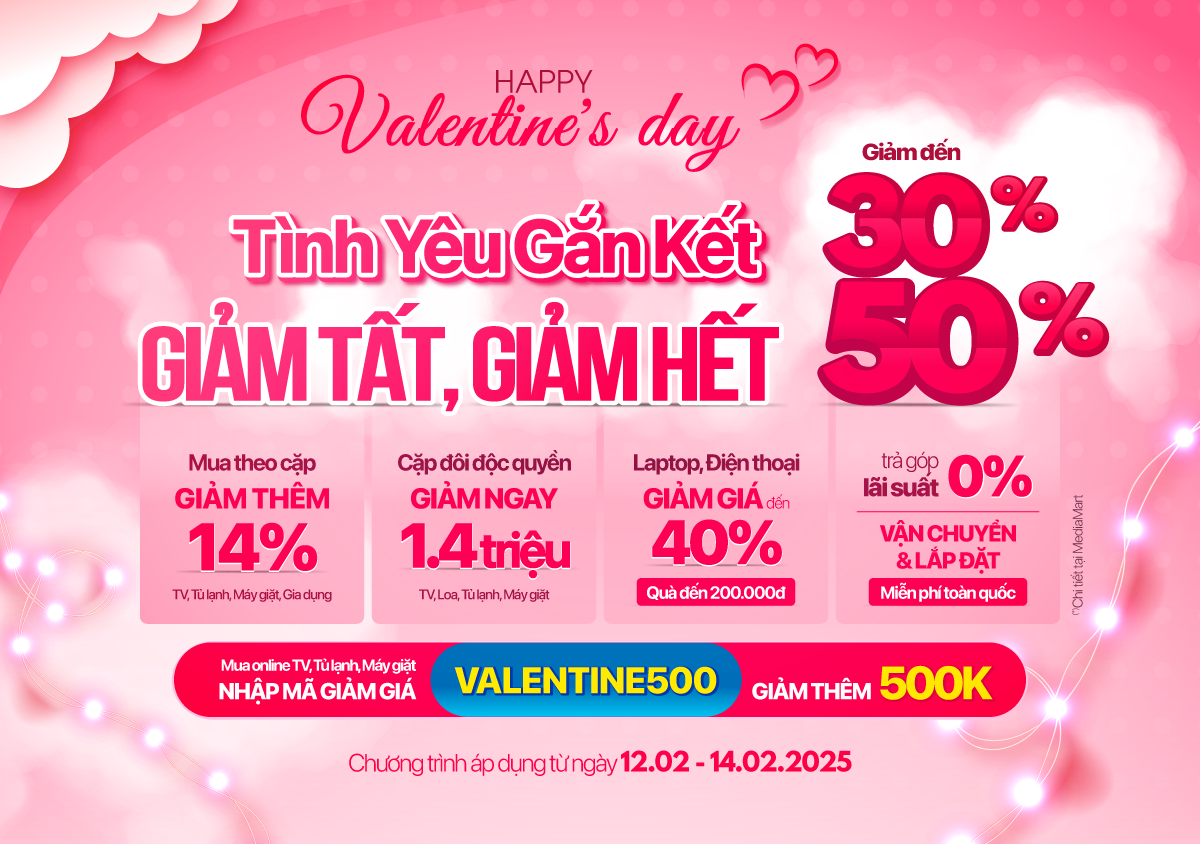 Ngày Lễ Tình nhân 14/2 đang đến gần, bạn đã chuẩn bị món quà ý nghĩa nào để dành tặng nửa kia của mình chưa? Hãy đến ngay MediaMart để khám phá chương trình khuyến mãi đặc biệt "Valentine - “Tình Yêu Gắn Kết, Giảm Tất, Giảm Hết" diễn ra từ ngày 12/02 đến hết ngày 14/02/2025. Đây là cơ hội tuyệt vời để bạn sở hữu những sản phẩm chất lượng với mức giảm giá lên đến 50% cùng nhiều quà tặng giá trị.