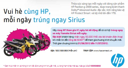 HP Việt Nam vừa chính thức khởi động chương trình khuyến mãi đặc biệt mang tên “Vui hè cùng HP, mỗi ngày trúng ngay Sirius” tại tất cả các siêu thị thuộc Hệ thống thế giới điện máy Media Mart. Đây là chương trình khuyến mại ấn tượng nhất trong năm của HP với giá trị quà tặng cực lớn là 41 chiếc xe máy Yamaha Sirius RC, dành cho khách hàng mua các sản phẩm MTXT HP Pavilion g-2000 tại các siêu thị Media Mart từ ngày 01/06/2012 đến hết ngày 11/07/2012.