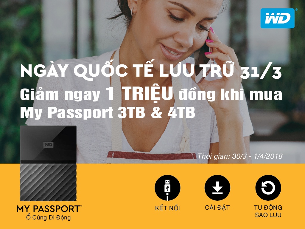 Nhằm tri ân đến người tiêu dùng trong ngày Quốc Tế lưu trữ 31/3, Western Digital đem đến chương trình giảm giá 1 triệu đồng khi mua sản phẩm My Passport 3TB và 4TB