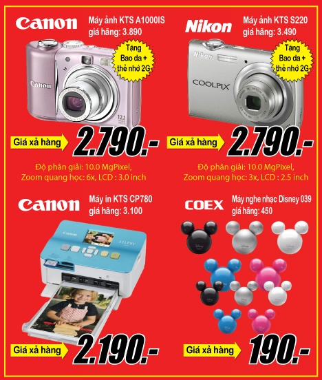- Máy ảnh kỹ thuật số Canon A1000 IS giá xả hàng chỉ còn 2.790.000 đồng, giảm 1.100.000 đồng so với giá hãng tặng kèm thêm bao da và thẻ nhớ 2Gb.