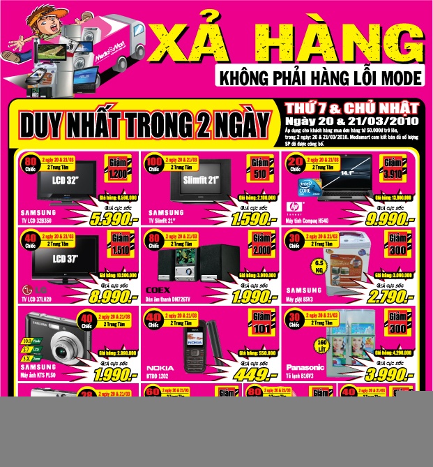 Trong đợt xả hàng lần 1 diễn ra từ ngày 20/03 đến hết ngày 25/03/2010. Mediamart sẽ giành những ưu đãi giá cực lớn cho toàn bộ khách hàng như: Chỉ duy nhất trong hai ngày 20 và 21/03/2010 và chỉ với đơn hàng từ 50.000 đồng trở lên khách hàng đã có cơ hội sở hữu hàng loạt sản phẩm với giá cực kỳ hấp dẫn:
