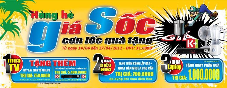 Với tín đồ hâm mộ bóng đá, mùa hè tới còn diễn ra một trong những sự kiện thể thao lớn nhất trong năm là vòng chung kết Euro 2012. Rất nhiều mẫu TV LCD, LED màn hình rộng được Media Mart giảm giá trong đợt này từ 10% cho tới 25%. Nhiều HDTV công nghệ LED 32 inch của các hãng Samsung, LG được bán với giá sốc rất hấp dẫn, còn TV LED 32" của hãng LG 32LV3100 bán với giá 6.490.000 đồng, SAMSUNG 32EH4000 giá bán 6.490.000 giảm 1.500.000 đồng... Chưa hết khi khách hàng mua TVLCD, LED, Plasma sẽ được tặng thêm máy xay sinh tố Philips trị giá 700.000 đồng.