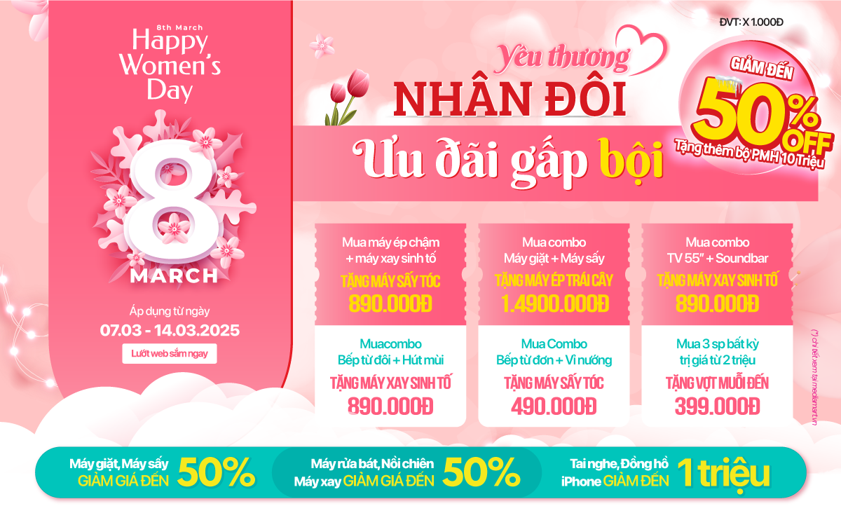 Chương trình “Yêu thương nhân đôi – Ưu đãi gấp bội” giảm 30-50% nhiều sản phẩm gia dụng như TV, tủ lạnh, máy giặt, máy sấy, máy rửa bát, nồi chiên không dầu, máy xay sinh tố, bếp từ, lẩu điện. Đặc biệt, khách hàng có thể nhận ưu đãi giảm ngay 500.000Đ – 1.000.000Đ khi mua iPhone, tai nghe hoặc đồng hồ thông minh.