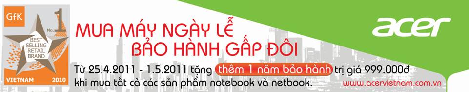 Nội dung: Khách hàng sẽ được tặng thêm 01 năm bảo hành khi mua các sản phẩm MTXT Acer, Gateway, eMachine  trong khoảng thời gian từ 25/4/2011 - 1/5/2011. Tổng cộng là 02 năm bảo hành.