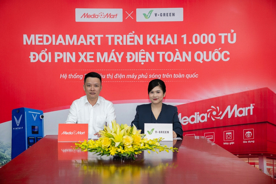 Hà Nội, ngày 23/04/2026 - Công ty Cổ phần Phát triển Trạm sạc Toàn cầu V-Green và Công ty Cổ phần MediaMart Việt Nam chính thức công bố thỏa thuận hợp tác nhằm phát triển mạng lưới tủ đổi pin xe máy điện trên toàn quốc. Hai bên sẽ cùng triển khai và hoàn thành 1.000 tủ đổi pin tại hệ thống 330 siêu thị điện máy MediaMart trên toàn quốc vào cuối tháng 5/2026.