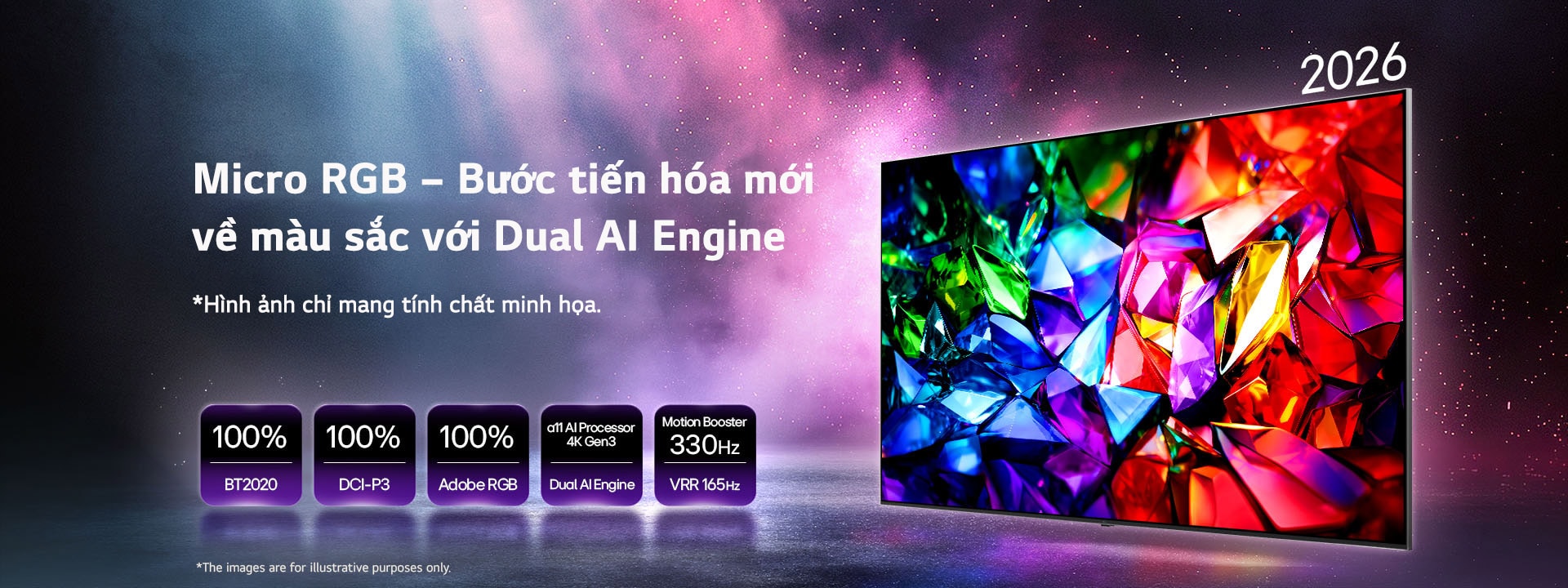 Được đúc kết từ 13 năm kinh nghiệm với OLED, Micro RGB evo là thế hệ TV RGB đầu tiên của chúng tôi — một bước tiến hóa đột phá vượt xa chuẩn mực Micro RGB thông thường. Với chứng nhận 100% độ phủ ba hệ màu, màu sắc giờ đây trở nên phong phú hơn bao giờ hết. Sở hữu bộ xử lý alpha 11 AI tương đương các dòng OLED với khả năng điều khiển 8,3 triệu điểm ảnh kết hợp cùng Micro RGB Engine giúp Micro RGB Technology và Micro Dimming Ultra tận dụng độ chính xác cấp điểm ảnh, tốc độ và sức mạnh của OLED evo để kiểm soát ánh sáng RGB cực kỳ chính xác. Mang đến trải nghiệm hình ảnh sống động mà chỉ Micro RGB evo mới có thể tạo ra